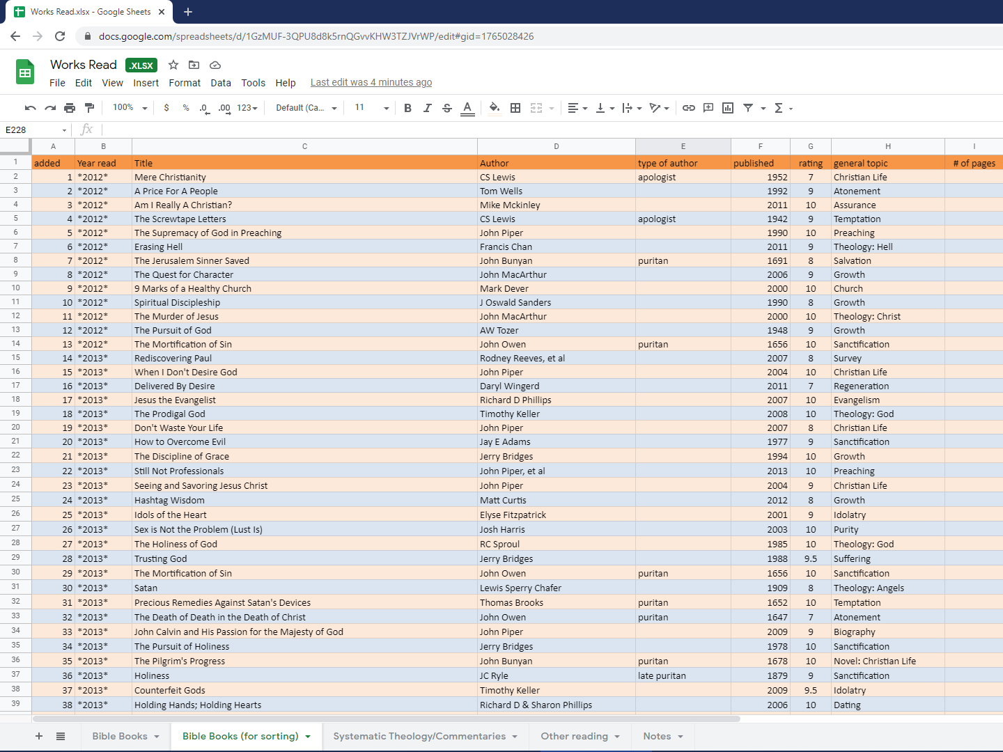 If you click the link above, it will take you to my reading list (the primary one is currently 227 books). I update it regularly as i finish reading another book. To get the most out of it, click “open with” at the top of the screen and select “Google Sheets.”