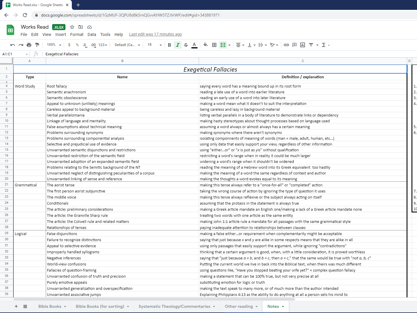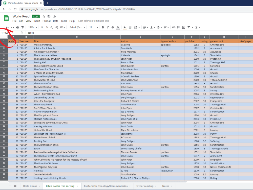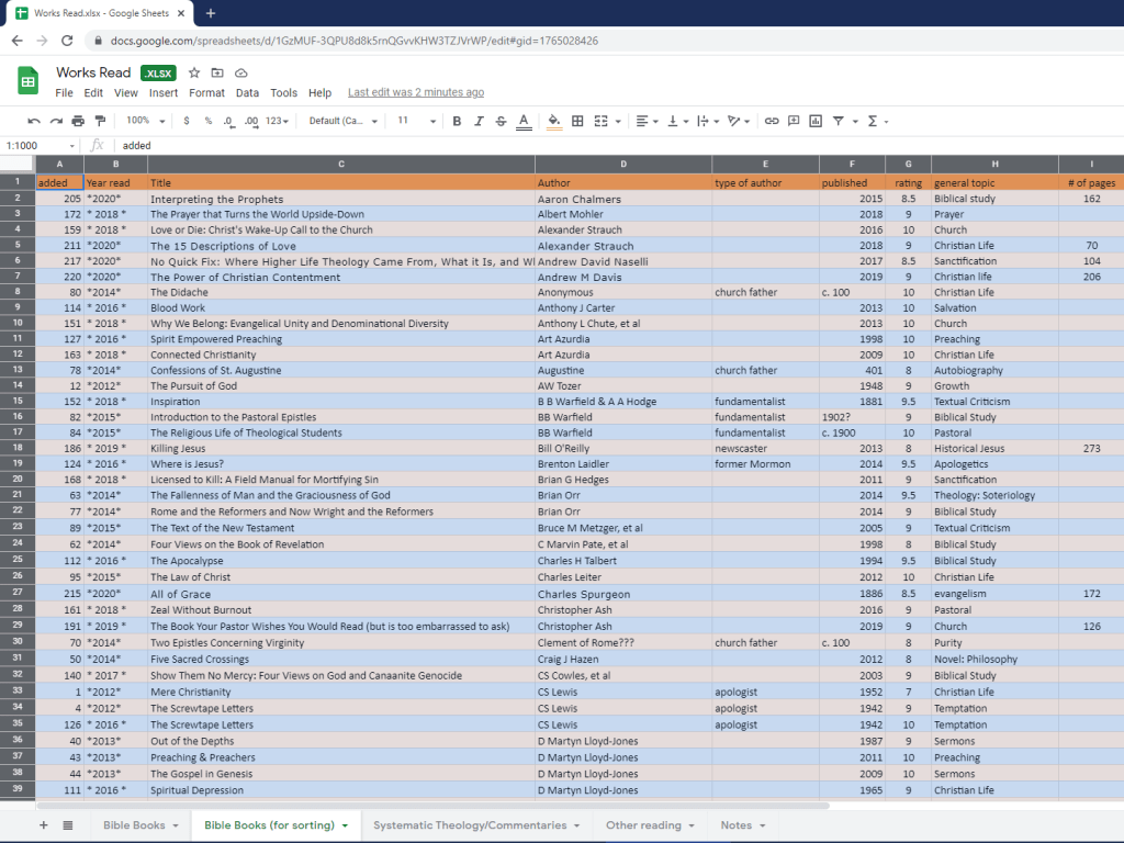 If you click the tab at the bottom, labeled “Bible Books (for sorting),” it will take you to an almost-replica of the previous tab. (Sometimes, i fail to update this as often as i update the prior, but currently, it is up-to-date.) The only thing it is missing from the previous tab is my “comments.”