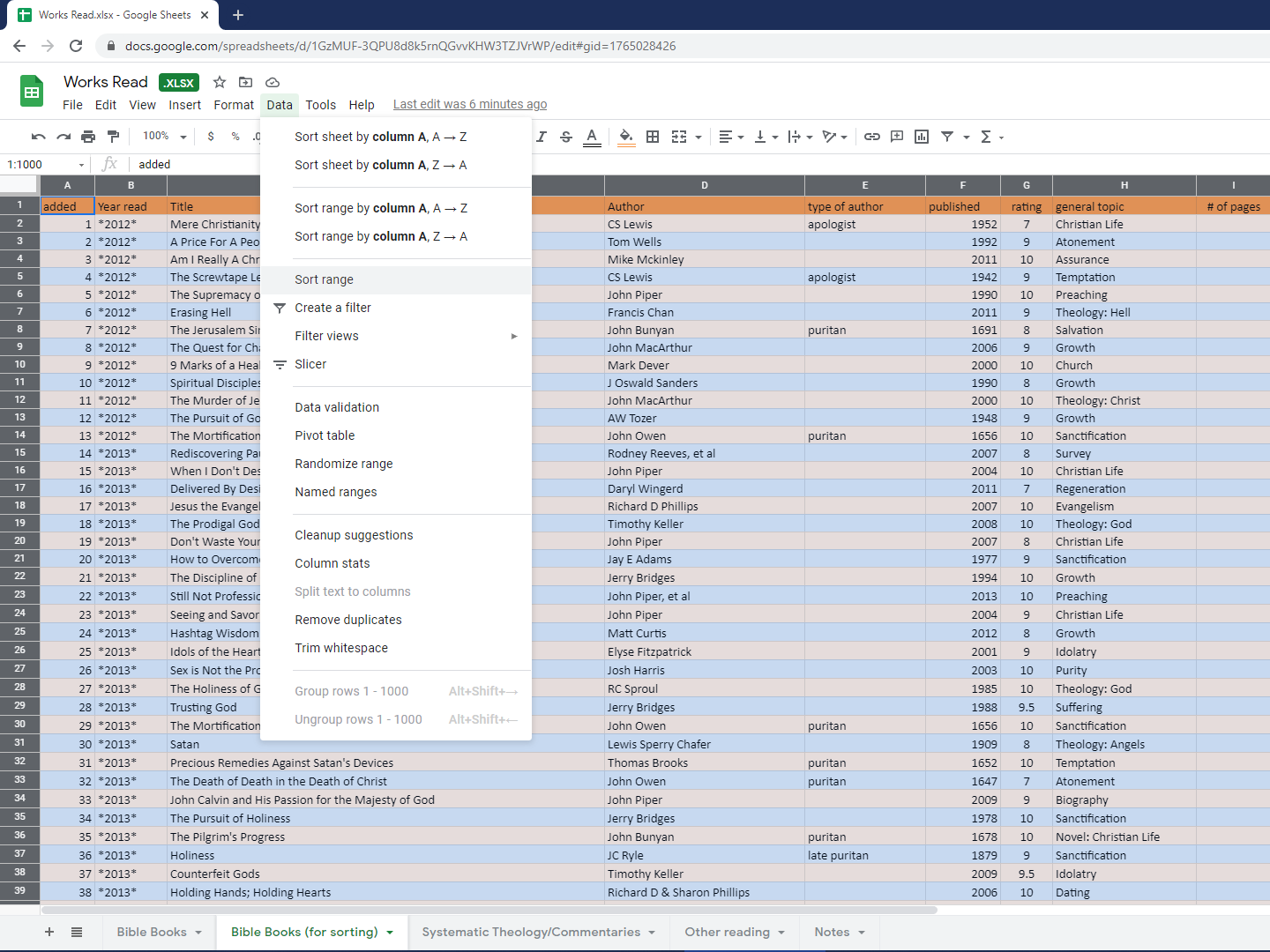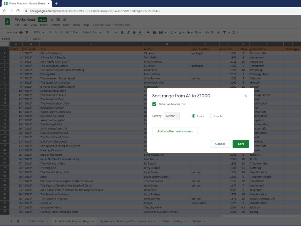 Click “Sort Range,” and you can sort the sheet by whatever you desire. Do you want to see which author i’ve most been influenced by? Make sure to select “Data has header row,” then sort by “Author” and “A-Z” (first image below) and scroll through, looking for the one which is repeated the most (second image below).
