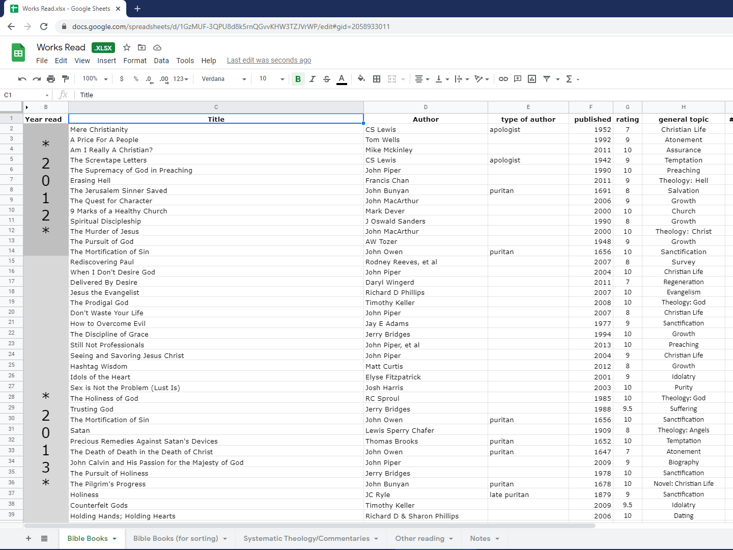However, around the end of 2011, my pastor told me that he kept track of all the books he read to easily remember and recommend them. As such, i decided to do something similar. Therefore, ever since 2012, i have kept a list of the books i read.